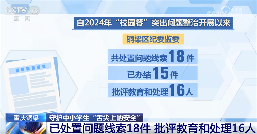 针对这些问题,铜梁区纪委监委结合区教委、财务、市场监管等部分持续加强监视查抄,自2024年“校园餐”凸起问题整治开展以来,共措置问题耳目。同时,鞭策铜梁区教委等部分对学校食堂采购、用餐等轨制进行,要肄业校食材的采购、验收和加工过程、标注原料品种和数量的养分食谱等向监管部分、学生家长等进行公开。学校食堂要实现师生用餐的食材同源、菜品价钱不异,师生菜品同锅加工、同窗取餐,就餐场合师生共享,鞭策食堂“阳光运转”,常态化接管监视。