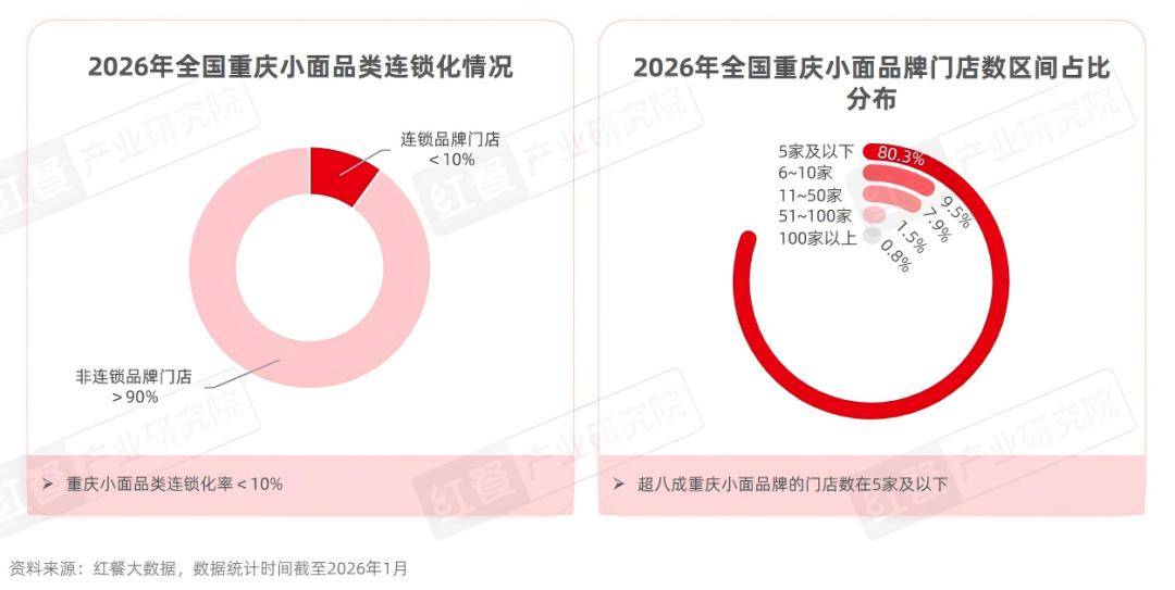 取面馆大赛道类似,沉庆小面赛道当前仍以夫妻店、街边摊为从,连锁化程度和品牌规模化程度全体偏低。红餐大数据显示,截至2026年1月,沉庆小面品类连锁化率不脚10%。此中,80。3%的品牌门店数正在5家及以下,而门店数正在100家以上的品牌数占比仅为0。8%。