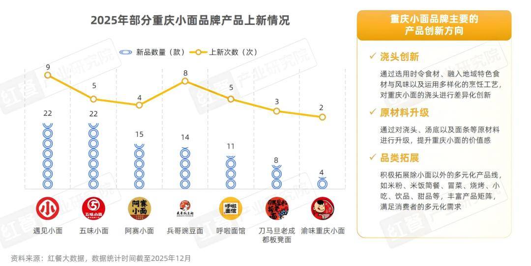 正在产物立异方面,为连结品牌活力和吸引更多的消费者,浩繁沉庆小面品牌纷纷加速产物立异程序。据红餐财产研究院不完全统计,碰见小面、五味小面、阿赛小面、兵哥豌豆面、呼啦面馆等品牌正在2025年推出的新品数量均跨越10款,此中,碰见小面取五味小面以22款新档次居榜首,阿赛小面则以15款新档次列第三。从上新频次来看,大都品牌连结了每季度推出新品的节拍。